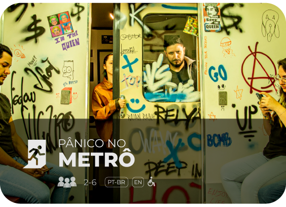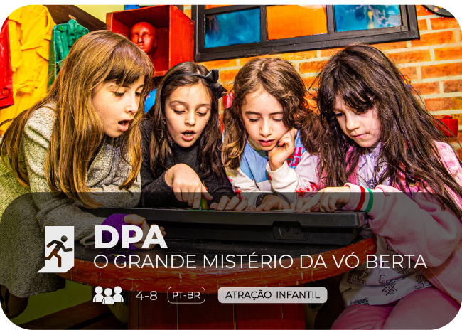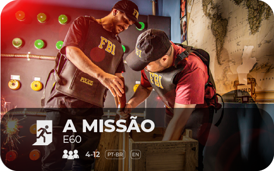 A quantidade de participantes depende da atração escolhida. Você pode consultar essa informação na página de cada atração. Sim! Também temos salas infantis no Escape 60′. No entanto, crianças menores de 12 anos devem estar acompanhadas por um adulto. Você não precisa fazer nenhum esforço físico, então pode usar roupas casuais. Não há um limite máximo ou mínimo de idade para participar do jogo. Todos são bem-vindos. O Escape 60’ é uma atividade divertida e lúdica na qual a inteligência e o trabalho em equipe são colocados à prova. A única exigência é que crianças menores de 12 anos estejam acompanhadas, durante a dinâmica, por pelo menos um adulto responsável por sala.