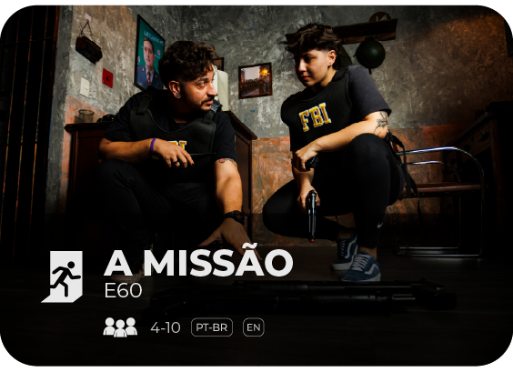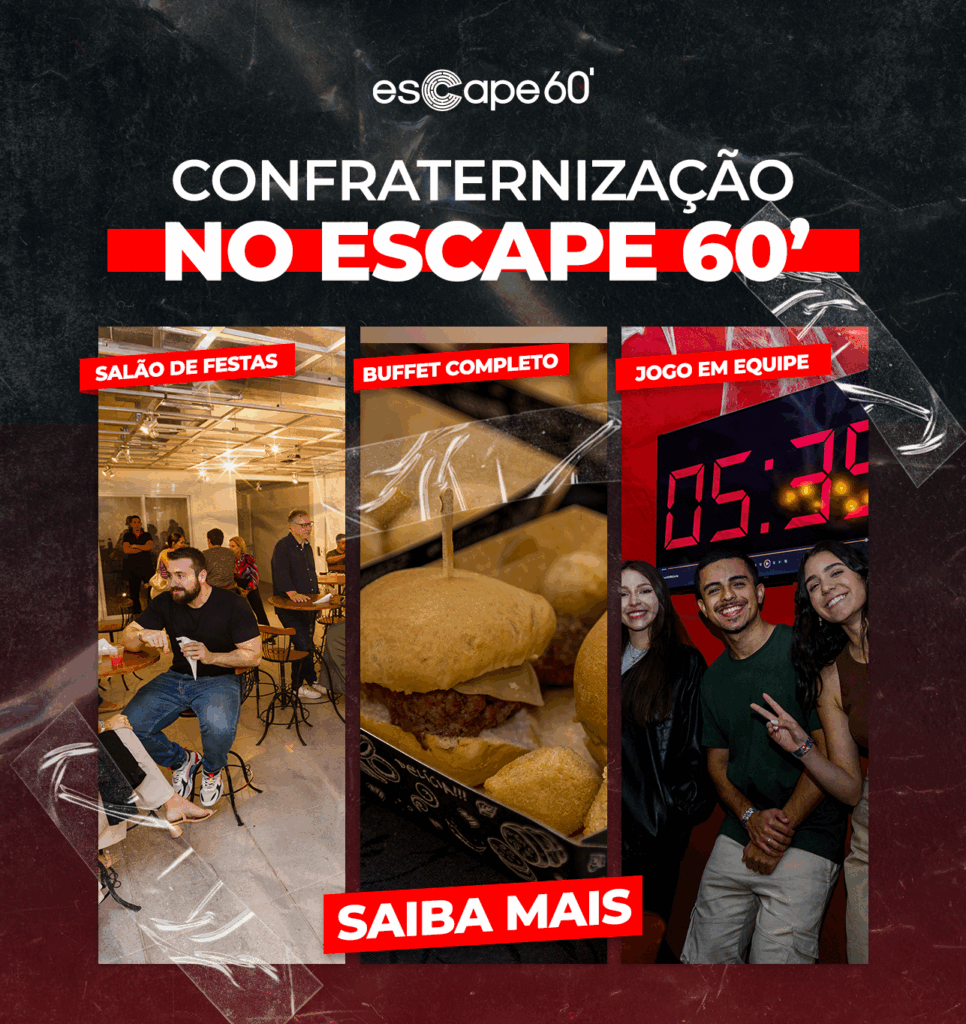 Escape 60’ é uma empresa especializada em Escape Games/Escape Rooms. Nesse tipo de jogo, os participantes escolhem uma sala temática na qual ficarão trancados e de onde deverão escapar. Cada sala apresenta um desafio a ser superado pelo grupo: o resgate de uma joia em um banco, a fuga de uma cela prisional, a descoberta de uma obra de arte em um ateliê, a procura pela fórmula em um laboratório, o resgate de uma pessoa sequestrada em um hotel e muito mais. Com a ajuda das pistas e dos enigmas escondidos no cenário, o grupo tem 60 minutos para desvendar o mistério e conseguir escapar do local. Atenção, disposição, trabalho em equipe e inteligência serão necessários para solucionar o enigma. Todas as salas do Escape 60’, por medidas de segurança e para monitoramento do jogo, possuem câmeras que ficam ligadas o tempo todo. Assim, as atividades realizadas nestes ambientes são filmadas pela empresa. As imagens captadas são de propriedade do Escape 60’ e não podem ser divulgadas para terceiros. A proposta da atividade é deixar os participantes trancados nas atrações como forma de criar uma ambientação e uma sensação de veracidade para as missões passadas. De acordo com as regras do jogo, só será possível sair do recinto quando o tempo expirar – isso é, passados os 60 minutos – ou quando o grupo solucionar o mistério. Entretanto, todas as atrações possuem botões de abertura das portas, permitindo a saída de um participante do jogo. Esta é uma medida de segurança para os clientes do Escape 60′. Uma vez fora da sala, o participante está eliminado do jogo, não podendo regressar para o interior do recinto. As demais pessoas que permaneceram na sala podem e devem continuar a atividade até o seu final. Se o tempo expirar antes da concretização da dinâmica, os Game Masters do Escape 60’ entrarão na sala para explicar ao grupo como eles poderiam fazer para sair, mostrando o local onde estavam escondidas as pistas e as charadas necessárias para solucionar o caso. Os participantes do jogo são proibidos de filmar ou fotografar no interior das salas. Essa é uma medida de segurança para evitar que as pistas e os enigmas da atividade sejam revelados posteriormente, atrapalhando aqueles que realizarão a dinâmica futuramente. Não. Todos os recursos necessários para a realização da atividade estão disponíveis na sala onde o jogo ocorrerá. Alimentos, bebidas e aparelhos eletrônicos não são permitidos dentro das salas do Escape 60′